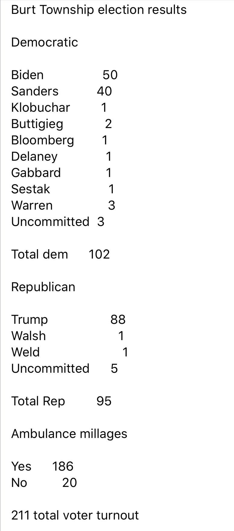 Home / News / Recent News / 2020 March Primary Results for Burt Township 2020 March Primary Results for Burt Township March 11, 2020 Results PrevPrevious NewsUpcoming Primary Election 2019 Next News2020 Budget Meeting & PacketNext