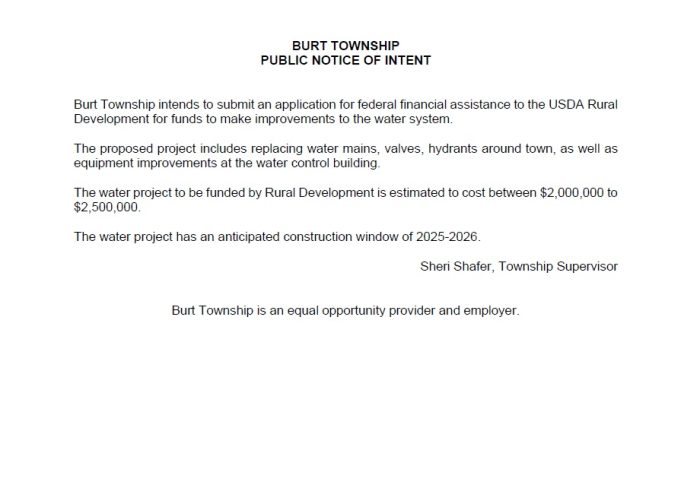 Home / News / Recent News / Burt Township – Public Notice of Intent Burt Township – Public Notice of Intent November 13, 2024 PrevPrevious NewsAlger County 2024 General Election Results (Unofficial) Next NewsSign up for Burt Township text alerts!Next
