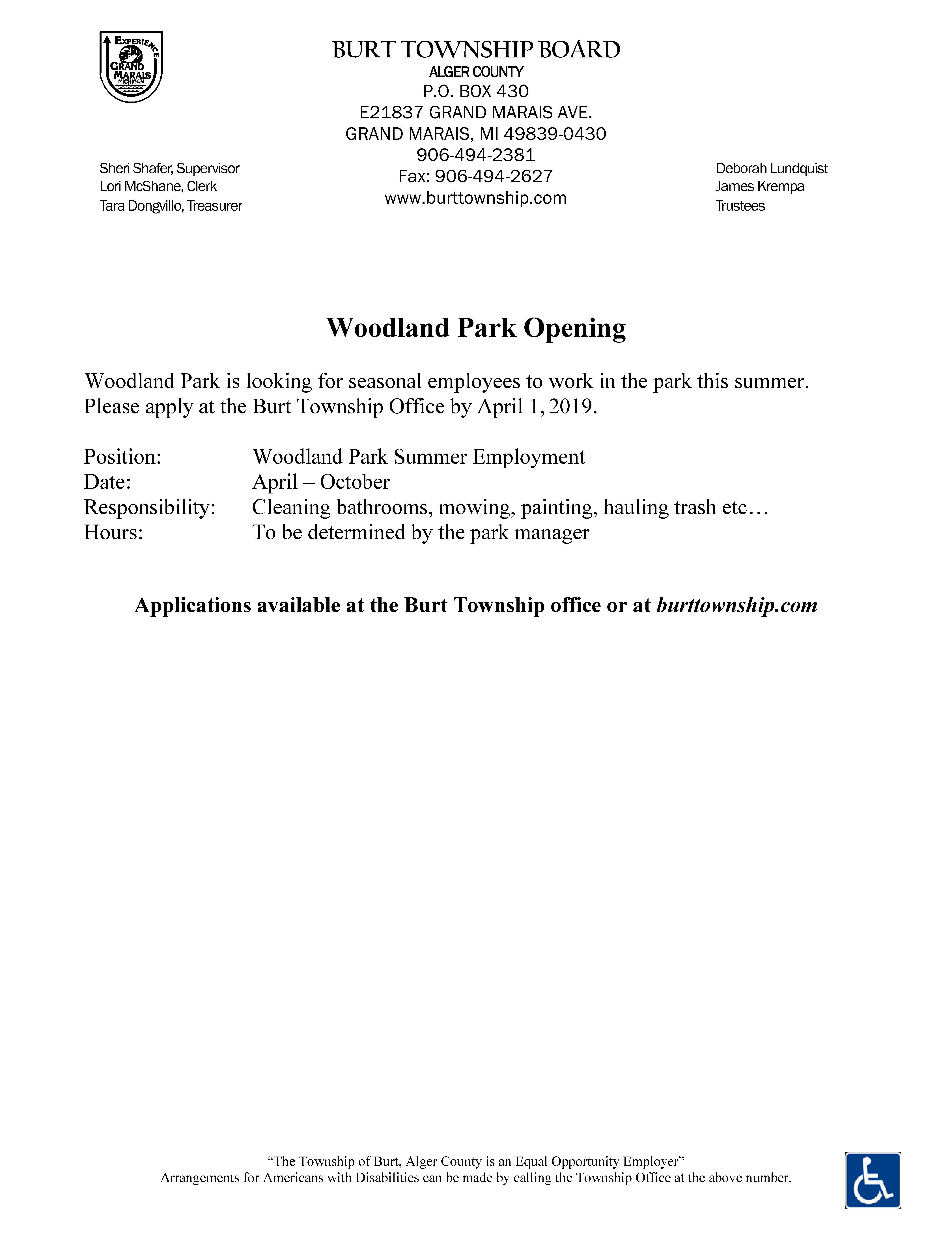 Home / News / Recent News / Woodland Park Summer Employment Opportunity 2019 Woodland Park Summer Employment Opportunity 2019 February 22, 2019 PrevPrevious NewsCommunity Conversation on Tourism in Grand Marais on March 28, 2019 Next NewsBudget & Policy Information 19-20Next